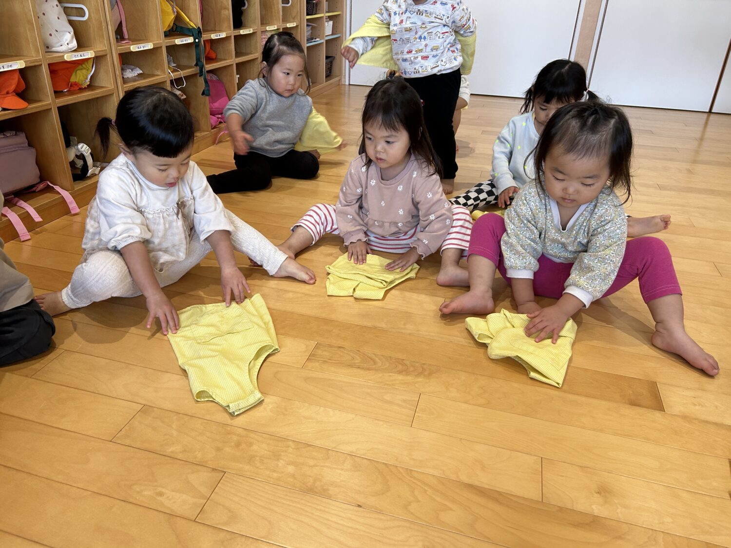 何でも「自分でできるよ!」とやる気いっぱいのあやめ組さんはスモックたたみも自分で頑張っています😊「はんぶんこ〜!」と上手になりました✨✨