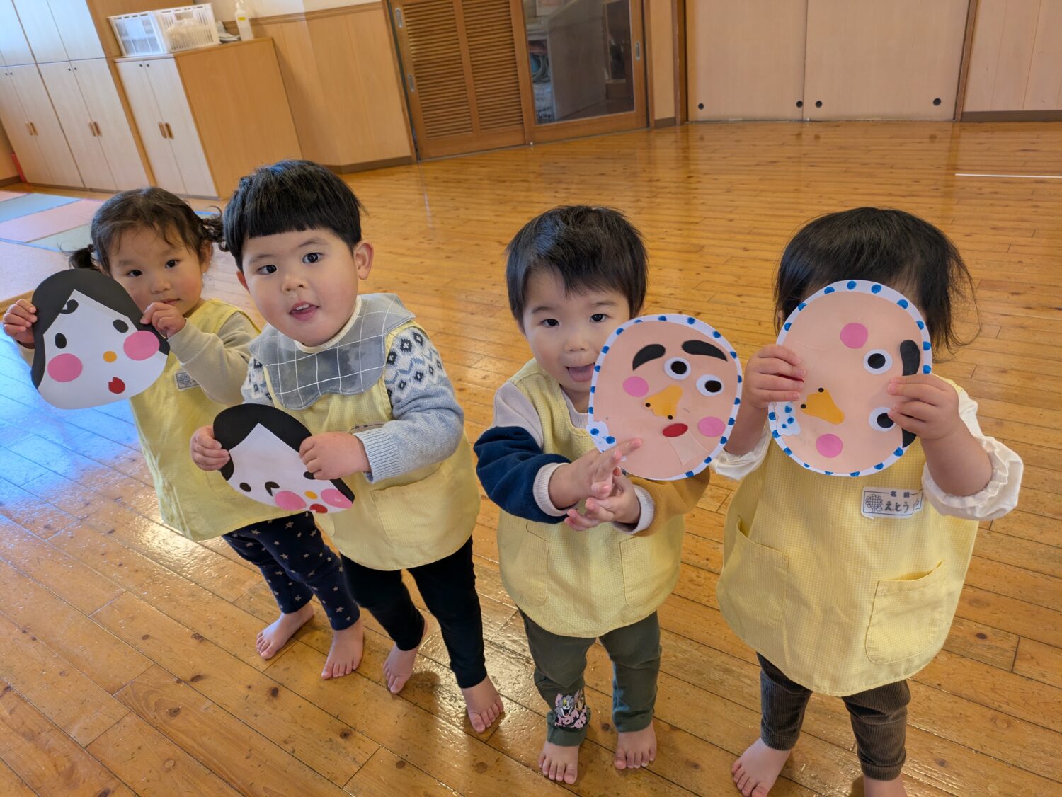 りす組では一足早く『福笑い』を楽しみました\(^o^)/色んな顔のパーツを上手に組み合わせて可愛いお顔がたくさんできましたよ♥