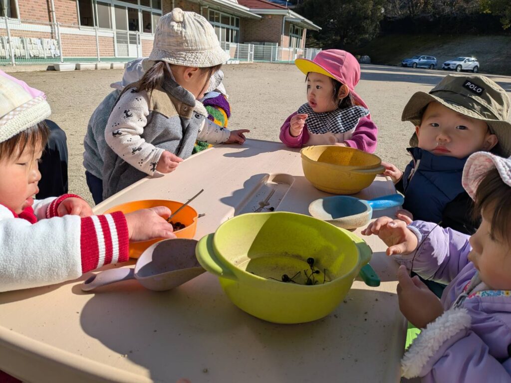 木の実🫒や枝を見つけて、ピクニックのはじまり、はじまり〜👏椅子にしっかり座ってお友達と楽しいね♫