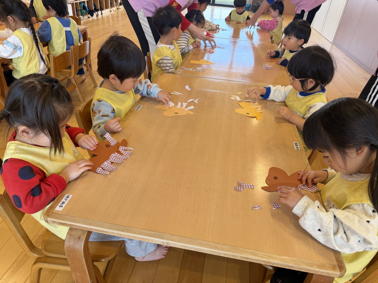 うめ組さんは午年🐴に、ちなんで🐴の制作をしました。折り紙を細かく破ってたてがみを貼って完成させました✨持って帰ることを伝えると大喜びしていましたよ♩♩
