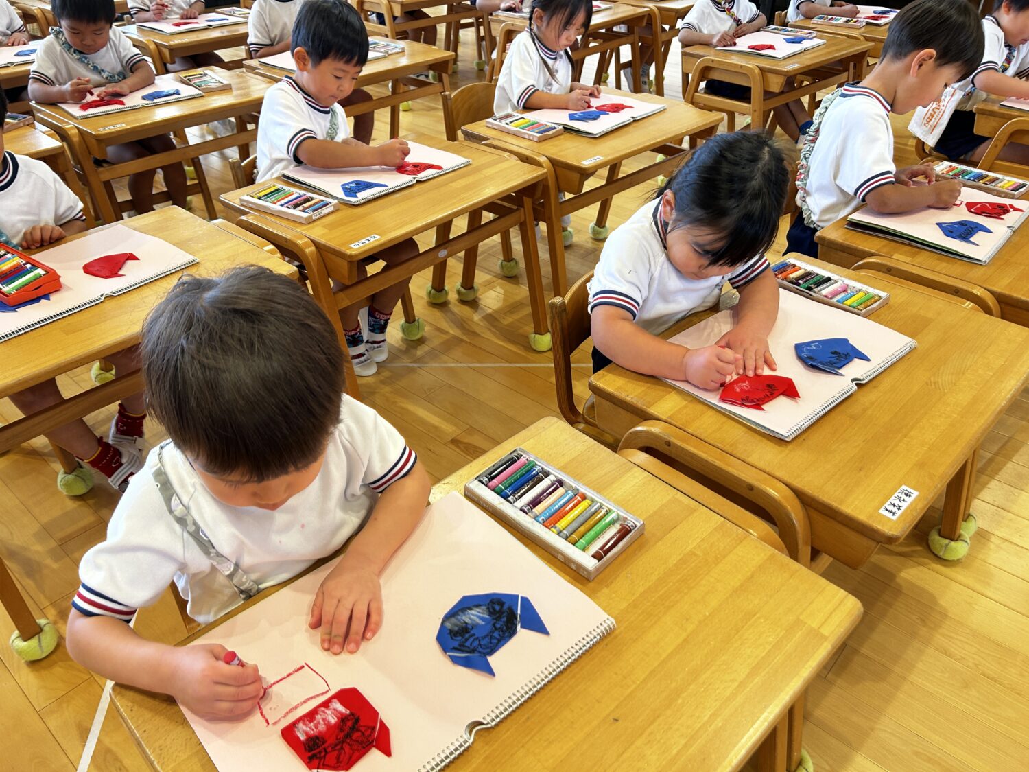 赤鬼と青鬼の顔を折り紙で折ったり、顔や体も上手に描けました🖍️