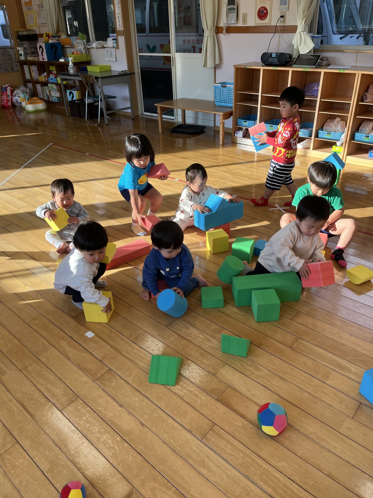 ブロックを積み重なることが出来るようになったつくし組さん。高く積んでいく「うわぁ!」と大喜びしてました🎵