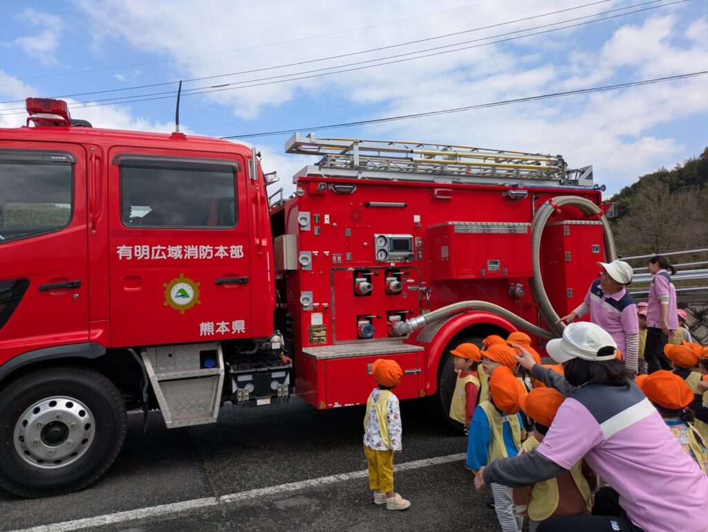 今日は、消防署立ち会いの災害避難訓練がありました!消防士さんと「お・は・し・も」のお約束をしましたね😊それから、あやめ組さんとうめ組さんは、消防車と救急車を見学しました!「かっこいいね〜!♡大きい〜!😳」と大興奮の子どもたちでしたよ🌈✨