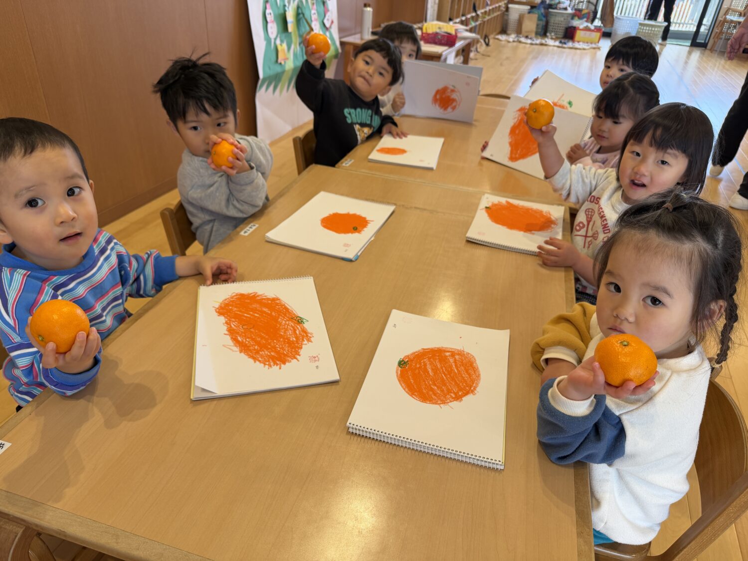今日は、みかん🍊を見ながらお絵描きをしました🖍みかんの形は丸で〜、色は橙!!ヘタは緑かな?みかんをしっかり見ながら描いていましたよ♩食べたくなっちゃったね😉