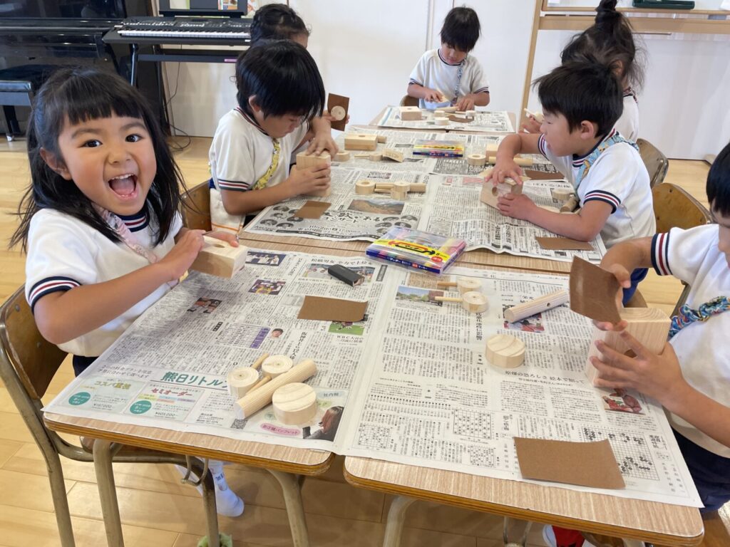 サンドペーパーで木をこすり「つるつるしてきた!」「木の匂いがするね!」と手触りや変化を感じていた子ども達😄
