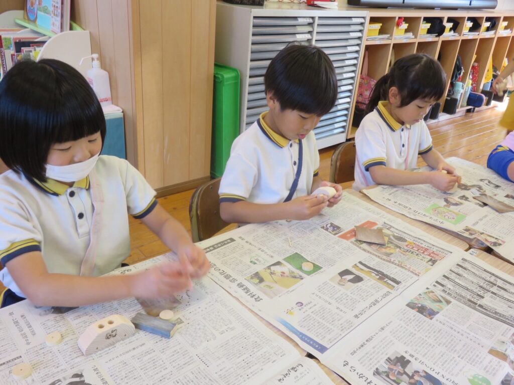 りす組さんではスポンジを片手に絵の具を塗り塗り〜🎨真剣な表情で隅々まで塗っていた子ども達でした\(^o^)/