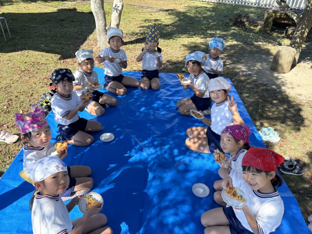 こどもの丘保育園のピザ窯でこんがり焼いたら出来たてのピザをいただきまーす😋✨