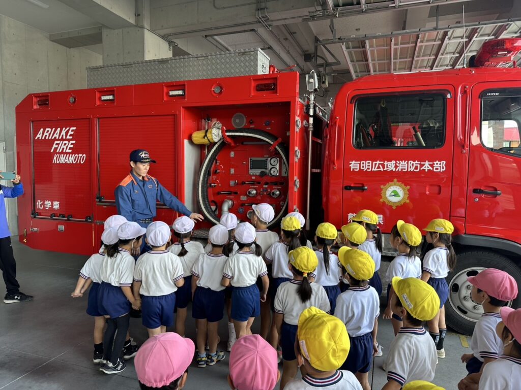 「かっこいい!」「大きいね!」と消防車や救急車、はしご車、他にも沢山の乗り物を見ることが出き大喜びの子どもたちでした😁